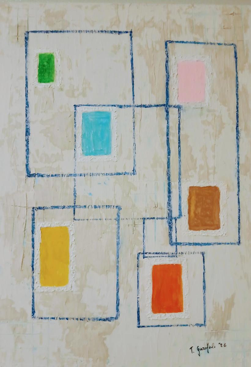 Gesso vinilico e acrilici 3 di 3 tele “Finestre sull’essere” è un trittico che esplora il concetto di visione come doppio movimento: osservare il mondo esterno e, allo stesso tempo, attraversare la dimensione interiore dell’individuo. Attraverso stratificazioni materiche realizzate con gesso vinilico e acrilici, le superfici diventano spazi di memoria ed emozione. Le forme geometriche, simili a finestre, suggeriscono soglie simboliche che invitano lo spettatore a riflettere sui propri stati d’animo e sulla relazione tra percezione e identità.