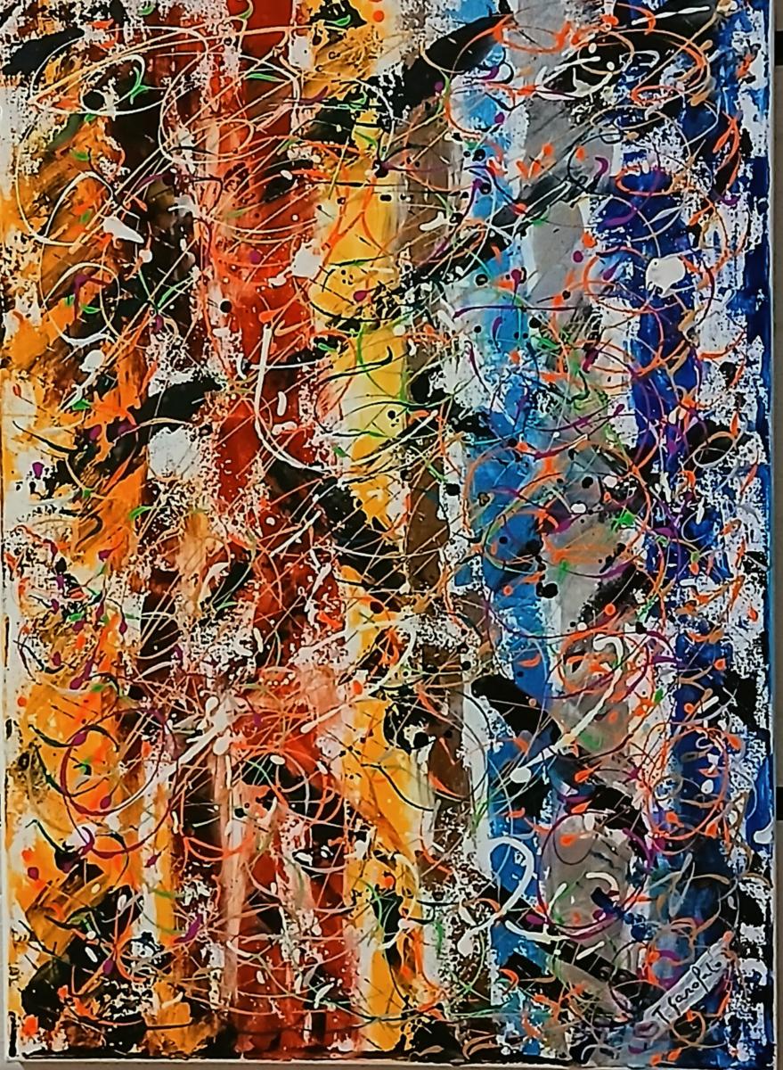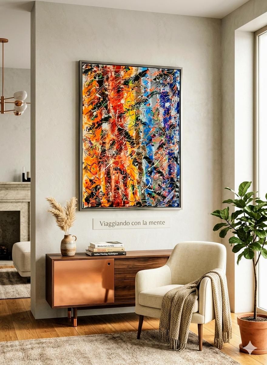 Questo dipinto su tela 50x70 è un pezzo di me: c’è l'energia del rosso, la calma del blu e in mezzo tutto il caos elettrico dei pensieri che si intrecciano. Non c’è un punto fermo, l’occhio si muove libero proprio come la mente quando crea. ?